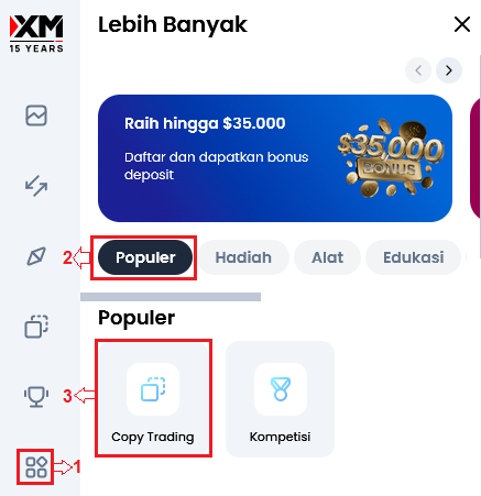 Pilik icon 4 kotak => geser ke menu populer => klik menu Copy Trading. (Contoh gambar di bawah ini)