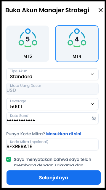 Pilih menu Manager Strategi => klik tanda + Sebelah kanan => kemudian Buka Akun Manager Strategi. Setelah formulir buka akun di lengkapi, Silahkan klik Selanjutnya. (Contoh gambar di bawah ini)