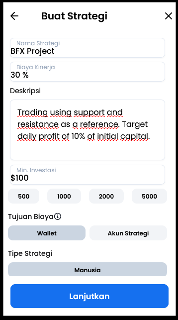 Sebelum isi formulir, minimal harus ada saldo $100 di akun trading XM anda. Isikan formulir Buat Strategi. Setelah semua formulir di lengkapi, Silahkan klik Lanjutkan. (Contoh gambar di bawah ini)